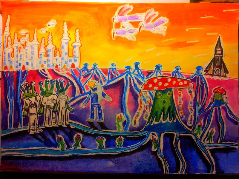 |  |  Класс: 6 ФИО автора: Туркин Александр Наставник: Никитина Юдия Михайловна Название картины: '"На Синей планете"' Техника: смешенная техника Город: Уфа Район: Советский ОУ: МБОУ "Школа № 27" |