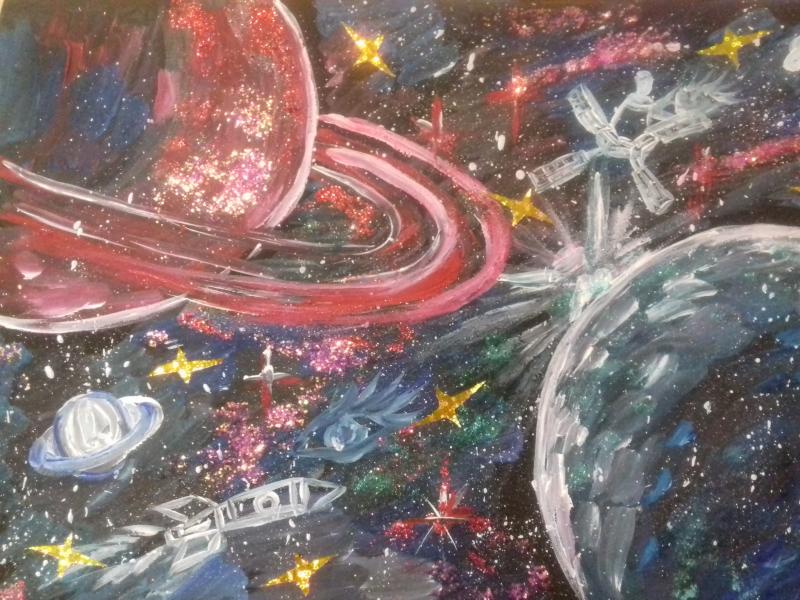 |  |  Класс: 6 ФИО автора: Капустина Роксана Наставник: Капустина Роксана Александровна Название картины: 'Космос' Техника: гуашь Город: Дмитриевка Район: Уфимский ОУ: МОБУ СОШ с. Дмитриевка |