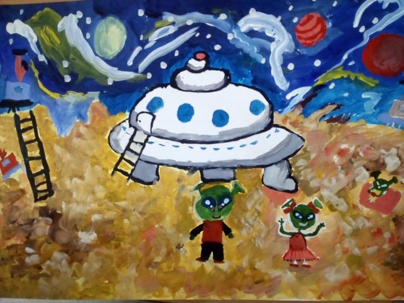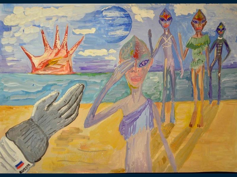 |  |  Класс: 3 ФИО автора: Васильева Рената Денисовна Наставник: Название картины: 'Первый контакт' Техника: гуашь Город: Уфа Район: Орджоникидзевский ОУ: МБОУ "Лицей № 106 "Содружество" |