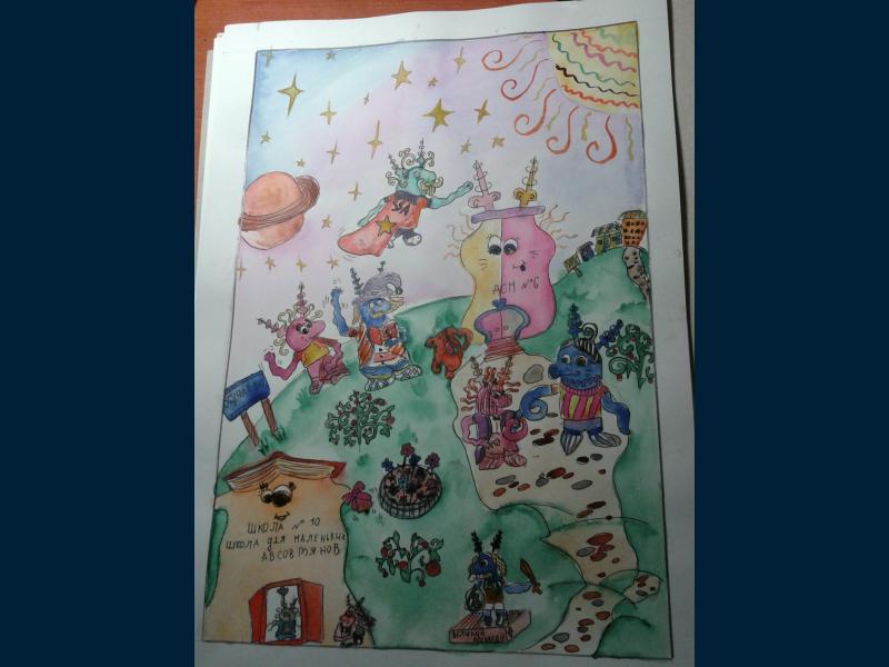 |  |  Класс: 5 ФИО автора: Исхакова Ксения Рамилевна Наставник: Лукманова Сания Галимзяновна Название картины: 'На планете Авсовтянов' Техника: смешанная техника Город: Туймазы Район: Туймазинский ОУ: МБОУ СОШ № 8 г. Туймазы |