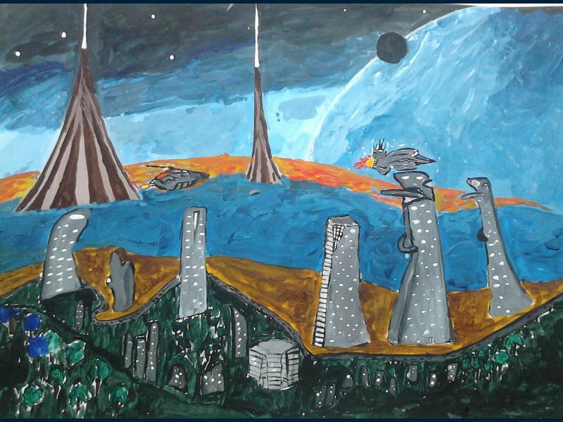 |  |  Класс: 4 ФИО автора: Шаров Саша Наставник: Аюпова Ризида Фазрахмановна Название картины: '"Лучший город Вселенной"' Техника: смешанная техника Город: Давлеканово Район: Давлекановский ОУ: МОБУ гимназия № 5 г. Давлеканово |