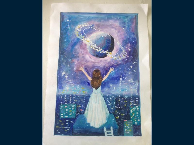 |  |  Класс: 6 ФИО автора: Азаматова Назлина Наставник: Гаврилова Любовь Ивановна Название картины: 'я и мой космос' Техника: акварель Город: Баймак Район: Баймакский ОУ: МОБУ СОШ № 3 г. Баймак |