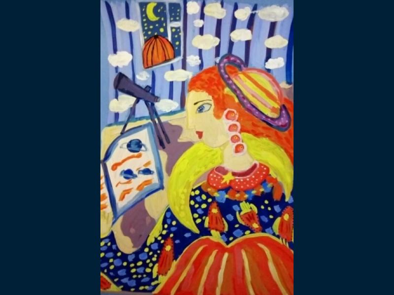 |  |  Класс: 8 ФИО автора: Винокурова Мария Владимировна Наставник: Винокуров Владимир Название картины: '"Космическая девушка"' Техника: гуашь Город: Уфа Район: Октябрьский ОУ: МАОУ "Лицей № 155" |