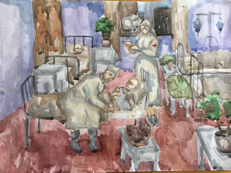 |  |  Класс: 7 ФИО автора: Кинзягулова Дина Наставник: Серкова Галина Алексеевна Название картины: 'Военный госпиталь' Техника: акварель Город: Ишимбай Район: Ишимбайский ОУ: МБОУ СОШ № 15 г. Ишимбай |