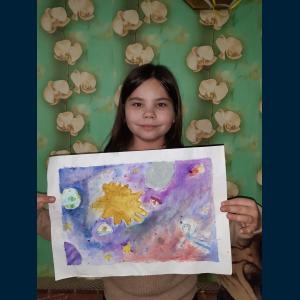 ![]() | ![]() | Класс: 3 ФИО автора: Байкина Кира ФИО учителя: Хатмуллина Гульчачак Фикиловна Название картины: 'Мой космический мир' Техника: акварель пазл |